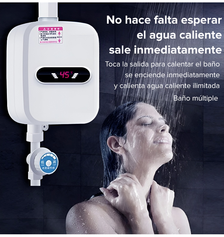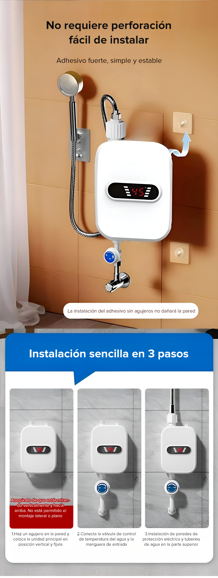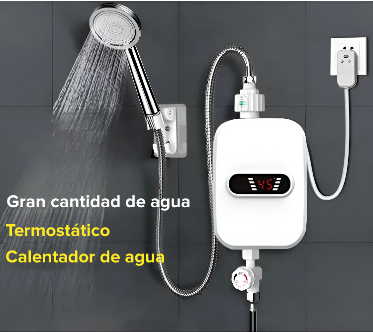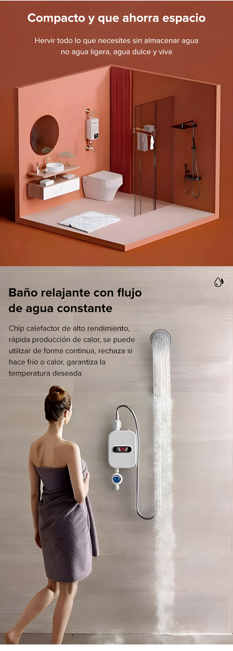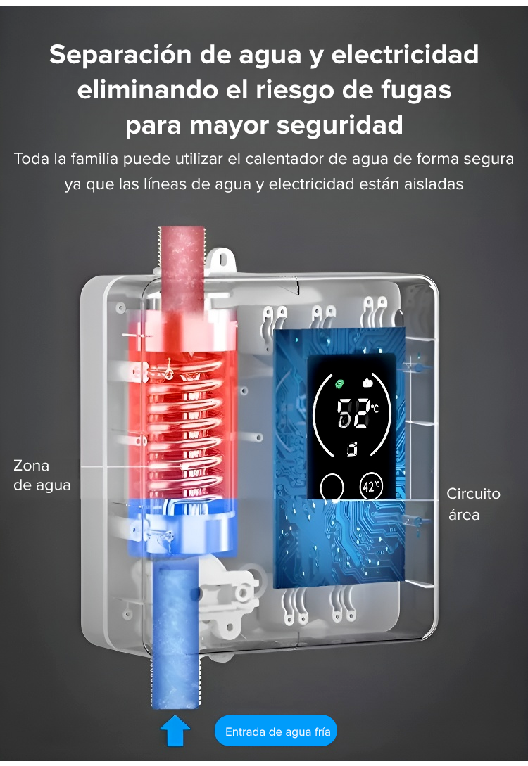 Eco calentador de paso: agua caliente en 1 segundo y máximo ahorro. Compacto (del tamaño de una hoja A4). Instalación sencillísima con video; tú mismo lo instalas. Inteligente y seguro: control preciso de temperatura, bloqueo infantil y apagado automático. Promo 24 h con garantía de devolución de tu dinero. Pruébalo sin riesgo.