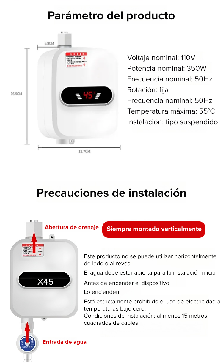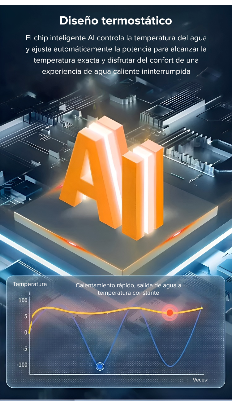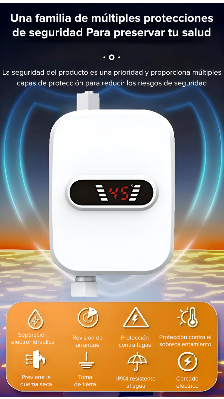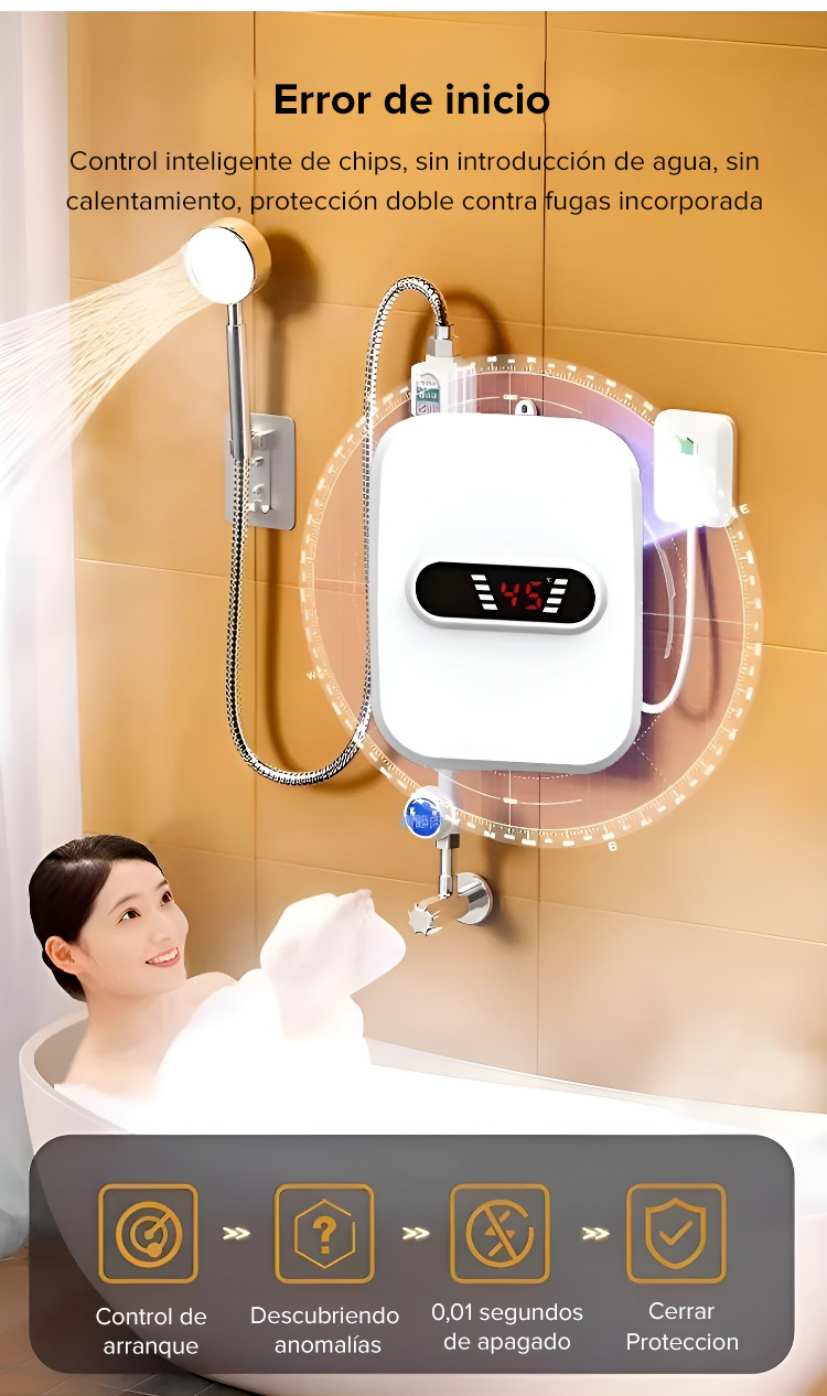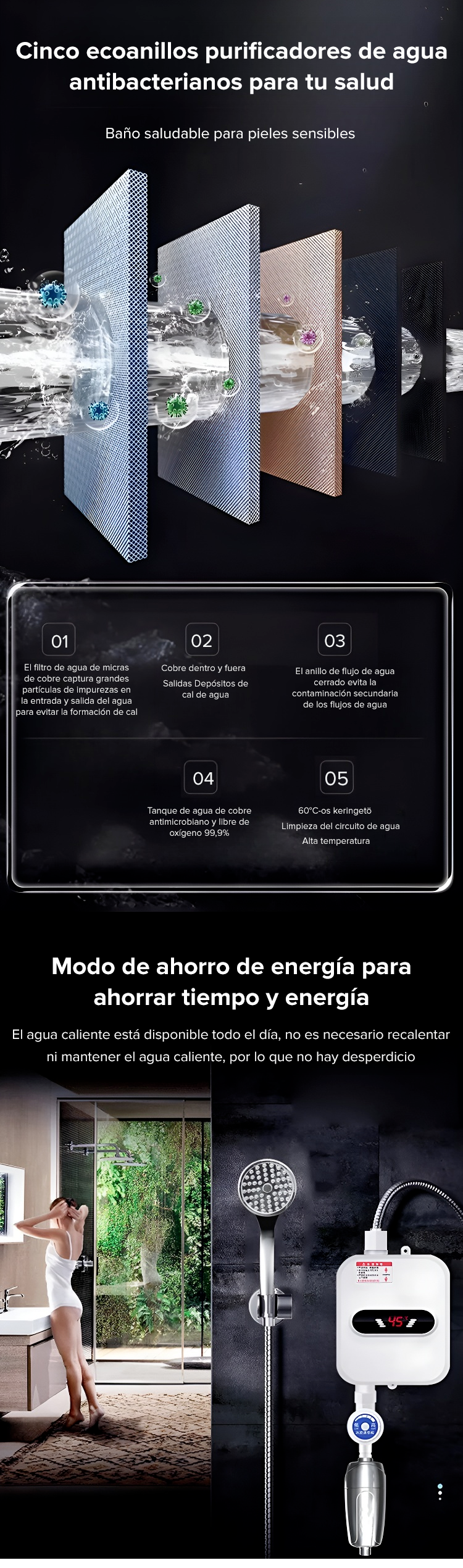 Eco calentador de paso: agua caliente en 1 segundo y máximo ahorro. Compacto (del tamaño de una hoja A4). Instalación sencillísima con video; tú mismo lo instalas. Inteligente y seguro: control preciso de temperatura, bloqueo infantil y apagado automático. Promo 24 h con garantía de devolución de tu dinero. Pruébalo sin riesgo.